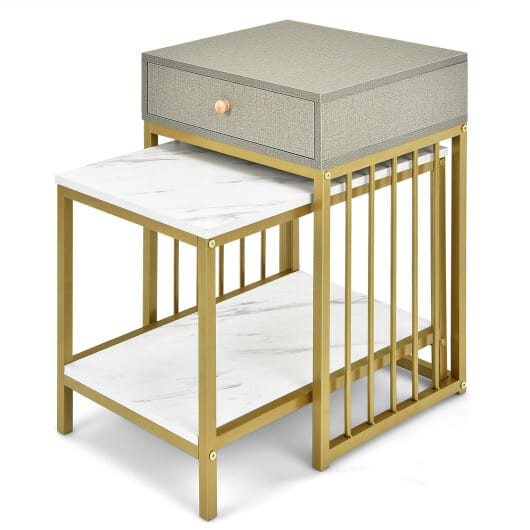 The side table can be put next to the sofa and the coffee table can take center stage in the living room. Overall qualified sturdiness is well ensured by the sprayed steel construction. Its non-slip bases enhance the stability and protect the floor. Besides the nesting table set also satisfies your daily storage needs. With a pull-out drawer the side table can hold your private items. With the 2-tier design the coffee table allows you to sort and arrange items. Because two tables are designed to be independent you can also use them in different places or put the side table under the coffee table to save space when not in use.