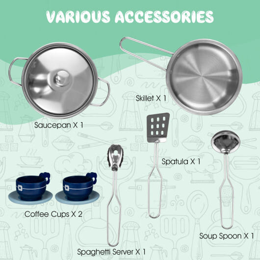 - All-in-one play set contains basic appliances of a real kitchen