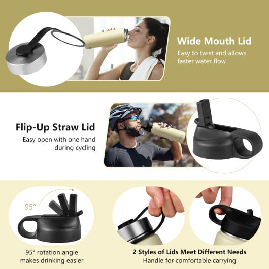 Double-walled insulation technology can keep beverages hot for up to 12 hours and cold for 24 hours. Besides made of food-grade and BPA-free materials this bottle does no harm to your health when you drink. It has a 360-degree sealing ring to prevent leaking and a side handle for easy holding offering you much convenience. Moreover we also design it with 1 wide mouth lid 1 flip-up straw lid and 1 straw to meet your different needs.