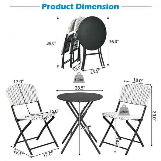 Specifications: Material: PE rattan steel Color: Black frame white & blue rattan Net weight: 37.5lbs Chair size: 22.5″ x17″ x33″ (L x W x H) Table size: 3.5″ x28″ (D x H) Seat height: 18.5″ Folded chair size: 39″ x18″ (L x W) Folded table size: 36″ x23.5″ (L x W) Weight capacity of table: 110lbs Weight capacity of each chair: 330lbs Box Qty: 1(May vary by batch)