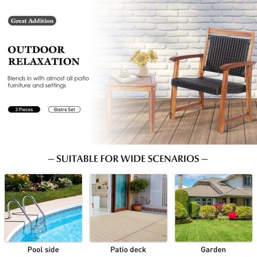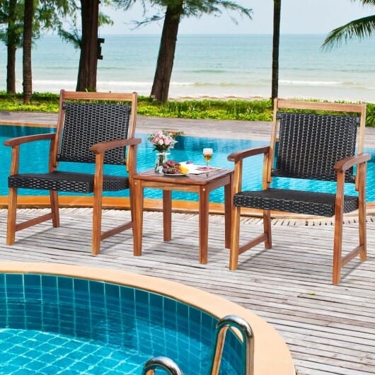 Solid hardwood material forms a strong structure for chairs and tables while the PE wicker guarantees a breathable seat and backrest. This bistro set creates leisure and intimate spot with 2 comfortable seats and a side table. Besides it is easy to assemble the chair set if you follow the instructions correctly. Elevate the outdoor settings with this 3-pieces outdoor patio furniture set!