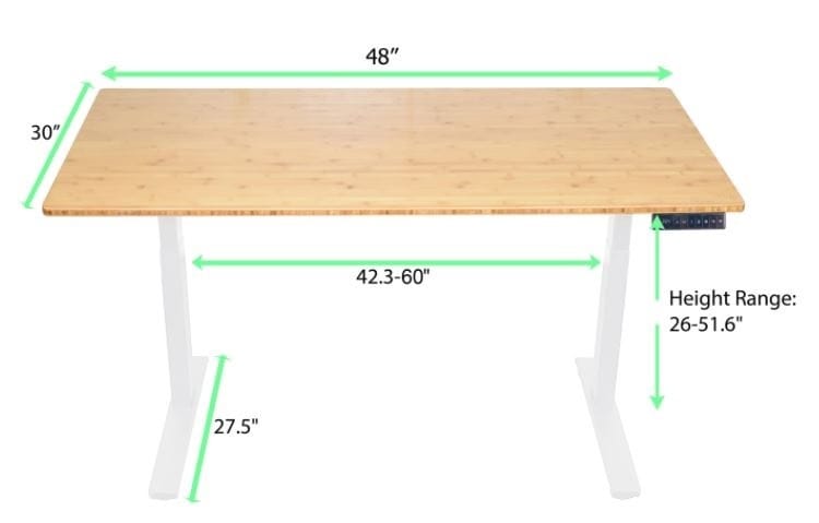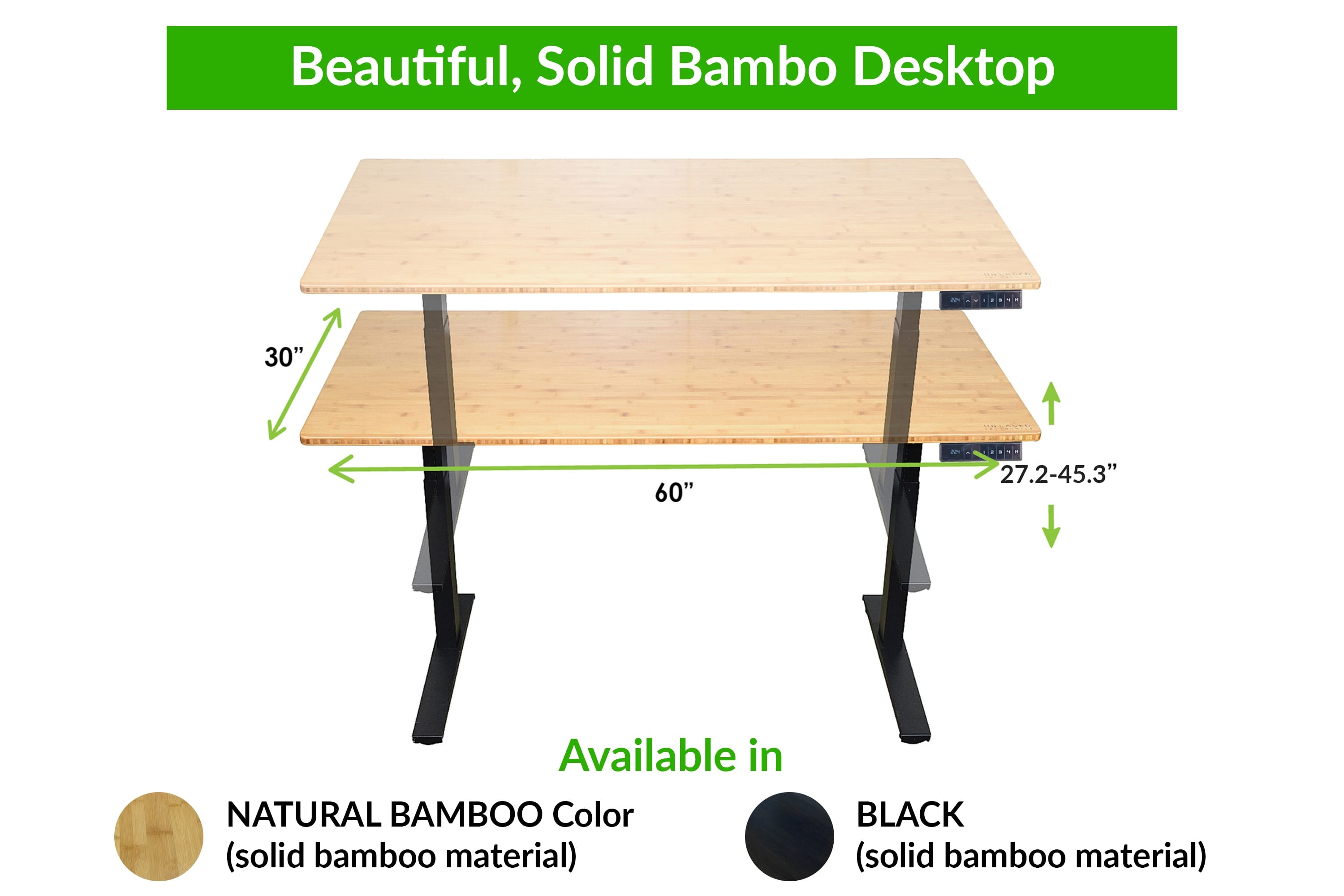 This adjustable height electric desk frame is topped with a beautiful 60×30″ solid, natural-colored bamboo desktop with a premium non-scratch finish that looks great in any office environment.