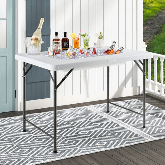 ● Waterproof HDPE tabletop and washable skirt for easy cleaning