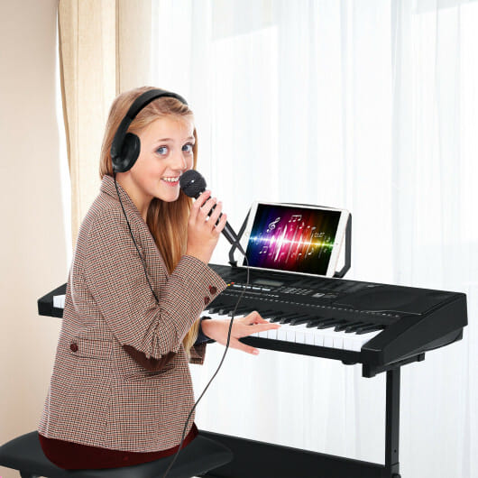 Specifications: Color: White + Black Material: PS ABS Metal Leather Keyboard Size: 36.5″ x 12″ x 3.5″(L x W x H) Stool Size: 16″ x 12″ x 17″(L x W x H) Keyboard Stand Height: 22.5″/25″/27″ Music Stand Size: 18″ x 8.5″(L x W) Stool Weight Capacity: 330 lbs Adapter Input: 100-240V 50/60HZ Max 200mA Adapter Output: 12V 0.5A Net Weight: 18 lbs Package Includes: 1 x 61-Key Electronic Keyboard 1 x Keyboard Stand 1 x Stool 1 x Music Stand 1 x Microphone 1 x Headphone 1 x Power Adaptor 1 x User Manual
