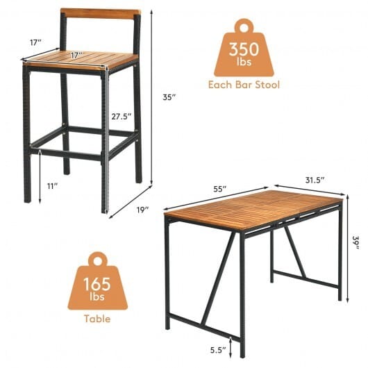 Specifications: Material: Acacia wood steel PE rattan Overall dimension of table: 55″ x 31.5″ x 39″ (L x W x H) Overall dimension of each bar stool: 19″ x 17″ x 35″ (L x W x H) Seat height from the ground: 27.5″ Net weight of table: 36 lbs Net weight of each bar stool: 12 lbs Weight capacity of table: 165 lbs Weight capacity of each bar stool: 350 lbs Box Qty: 3(May vary by batch)Package includes: 1 x Bar table 6 x Bar stools