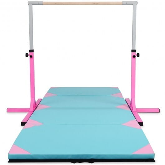 Specifications: Color: Blue/Pink Material: Steel + wood + PP Dimension: 79″ x 59″ x 59″ (L x W x H) Product weight: 57 lbs The thickness of the steel arms: 0.08″ Bar diameter: 1.6″ Adjustable height: 36″ – 59″ Weight limited: 225 lbs Package includes: 1 x Kids horizontal bar