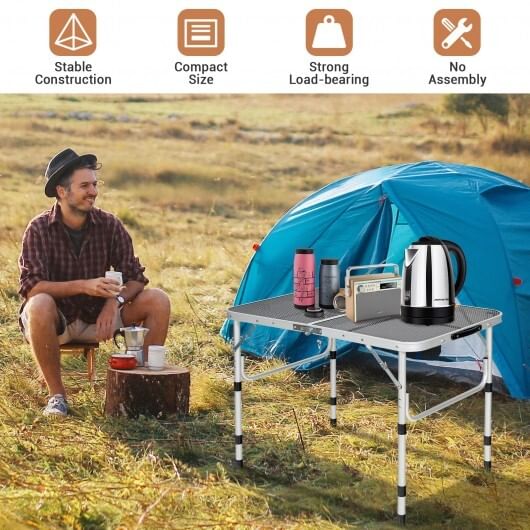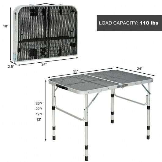 Comes with aniron mesh tabletop the picnic dinging table can ensure great support and dissipate heat well.And its aluminum frame with excellent sturdiness can load up to 110 lbs. What’s more the anti-skid foot pads enhance using safety. So you can put all stuff on the table without worrying about accidentally tipping over. The camping table has 4 different heights for you to choose by adding or reducing the leg tubes. And this outdoor camping table is foldable for effortless carrying and space-saving storage. Compact briefcase size with side carrying handle allows you to take to anywhere possible. Specially designed for outdoor activities the folding grill table facilitates the prepare for camping.