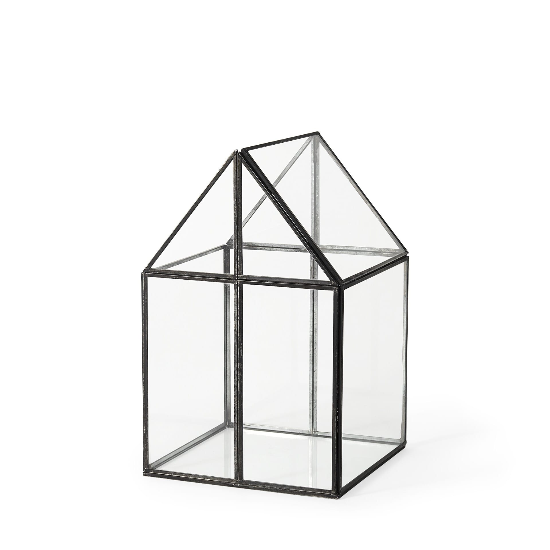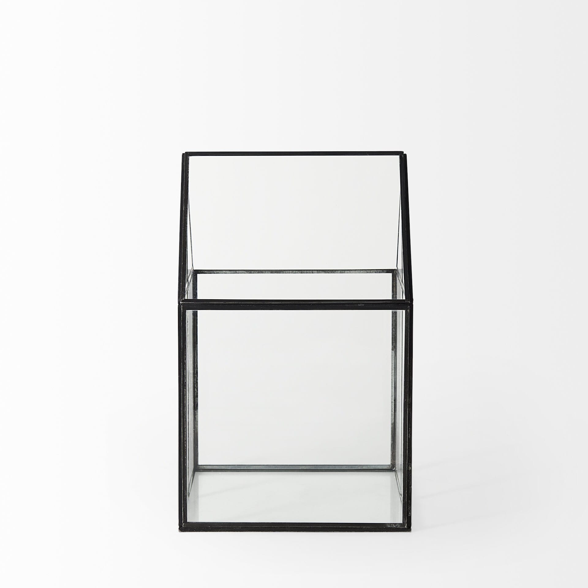This House Shaped Glass Terrarium is the perfect way to bring in an element of fresh contemporary design to the decor in your home. This terrarium is shaped liked a house and is made from a mix of glass and metal. The black metal frame has thin edges and adds a touch of elegance to this whole piece. Within the black frame there are glass panels that add a light and airy feel to the look of this terrarium. There is an extra metal rod that runs through the middle of the glass panel at the front and the back. You can use this terrarium to display your plants and flowers, or it can be used to store decor pieces that you want to protect. This terrarium will also look great just as a stand-alone decor piece no matter what interior style or colors you already have in your home. 13″ H x 8″ W x 8″ D