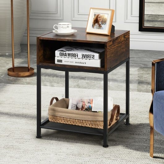 Specifications: Color:Brown + Black Material:Engineered Wood Metal Overall dimension: 16″ x 16″ x 22.5″(L x W x H) Interior Size of the Storage Cubby:14.5″ x 15″ x 6″ Height of the Legs:3.5″ Weight Capacity of Tabletop:44 lbs Net Weight:16.5 lbs Box Qty: 1(May vary by batch)Package includes: 1 x Storage side table 1 x Instructions