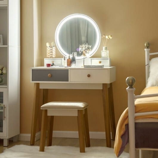 It is made of high quality MDF and in great appearance with a round mirror and 4 drawers and the wood surface becomes smooth and solid after delicate workmanship. The solid structure could hold a lot of cosmetics and other small items. It also fits various environments such as bedroom and living room. The light can be lit up by touch switch and adjust three color temperatures. Smart touch switches do not spark when opening or closing lamps and wet hand touch is also safe. You will keep natural makeup every day.