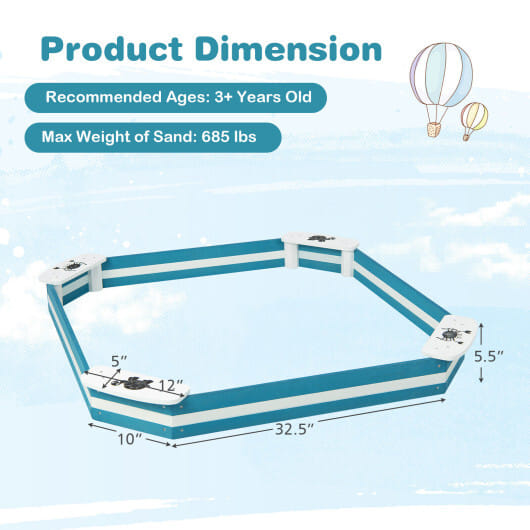 Specifications: Color Blue whiteMaterial Cedar WoodOverall Dimension 49.5″ x 49.5″ x 5.5″Net Weight 9 lbsWeight Capacity of Each Seat 66 lbsMax Weight of Sand (Not Included) 685 lbsRecommended Ages 3+ yearsBox Qty1(May vary by batch)