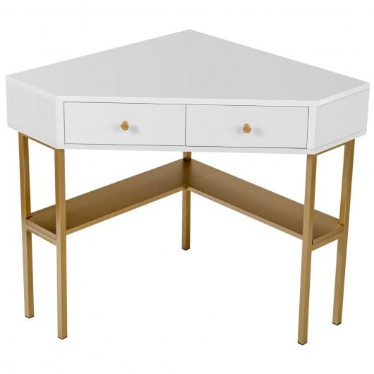Specifications: Color Black/Golden/White Material Engineered Wood MDF Metal Overall Dimensions 39.5″ x 28″ x 29.5″ (L x W x H) Front Edge of Tabletop 27″ Short Side Edge of Tabletop 8.7″ External Dimension of Drawer 12.4″ x 4.3″ (L x W) Interior Dimension of Drawer 9.5″ x 10.5″ x 4″ (L x W x H) Dimension of Bottom Shelf 26″ x 6.3″ (L x W) Height Between Drawer and Shelf 10.8″ 2 Outlets 125V 12A 2 USB Ports and 1 Type-C 15.5W Power Cord Length 5 ft Weight Capacity of Tabletop 110 lbs Weight Capacity of Each Drawer 20 lbs Weight Capacity of Shelf 55 lbs Net Weight 42 lbs Box Qty 1(May vary by batch)