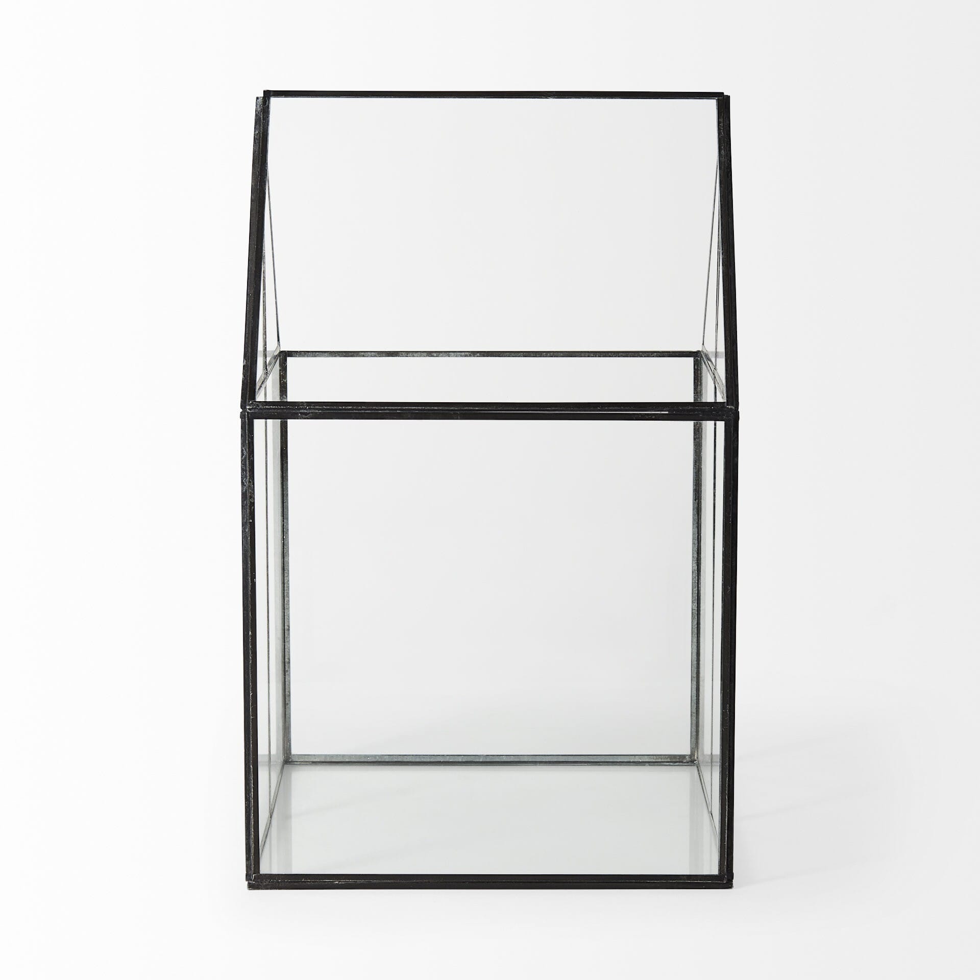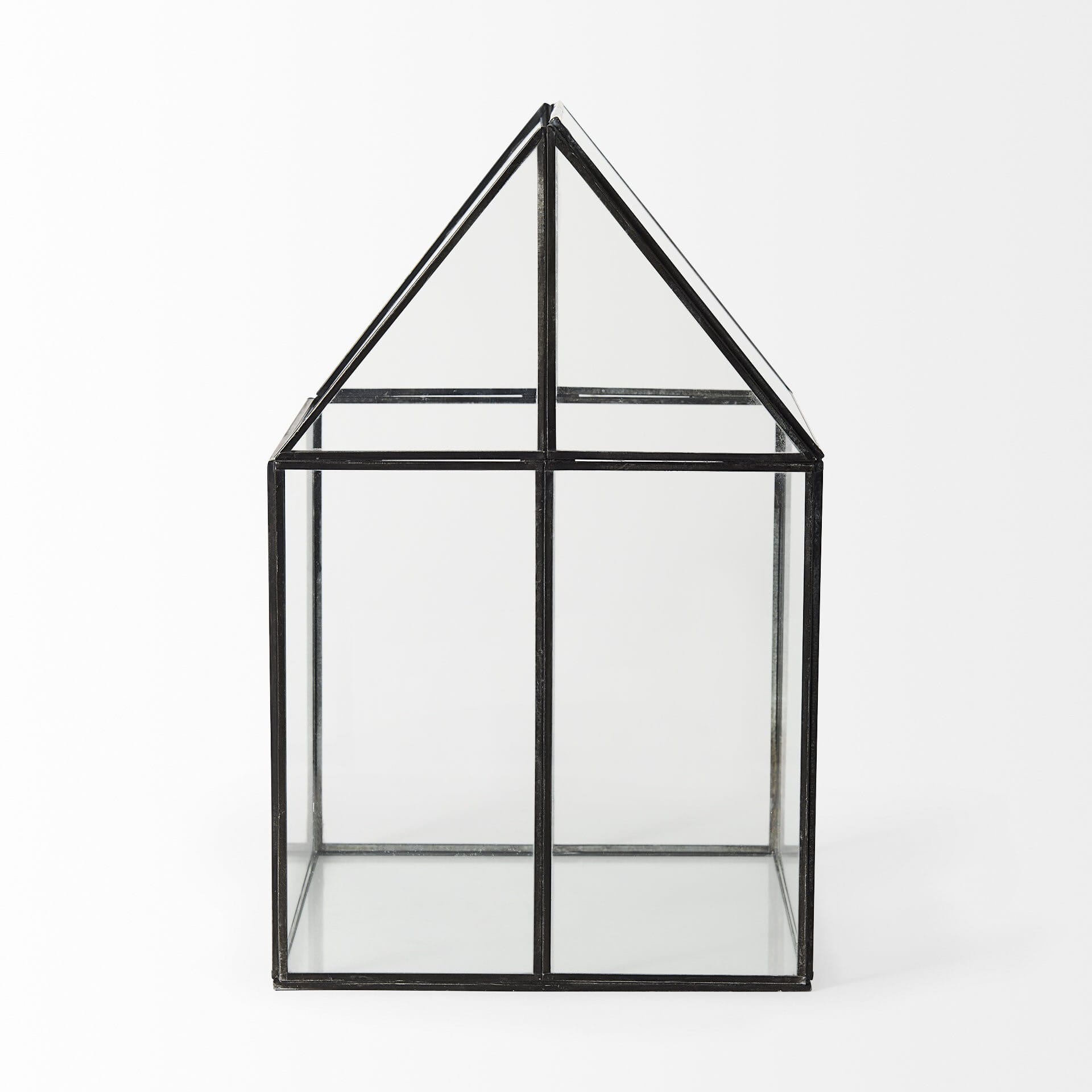 This XL House Shaped Glass Terrarium is the perfect way to bring in an element of fresh contemporary design to the decor in your home. This terrarium is shaped liked a house and is made from a mix of glass and metal. The black metal frame has thin edges and adds a touch of elegance to this whole piece. Within the black frame there are glass panels that add a light and airy feel to the look of this terrarium. There is an extra metal rod that runs through the middle of the glass panel at the front and the back. You can use this terrarium to display your plants and flowers, or it can be used to store decor pieces that you want to protect. This terrarium will also look great just as a stand-alone decor piece no matter what interior style or colors you already have in your home. 16″ H x 10″ W x 10″ D